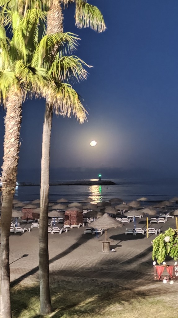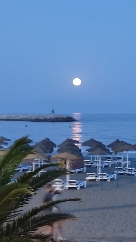 Termino esta sesión sobre Benalmádena, con esta esplendida luna llena y bello reflejo en el mar, el día 24 de junio de 2021. Con una imagen de la luna llena, vista con un telescopio astronómico con 80 aumentos desde la playa.